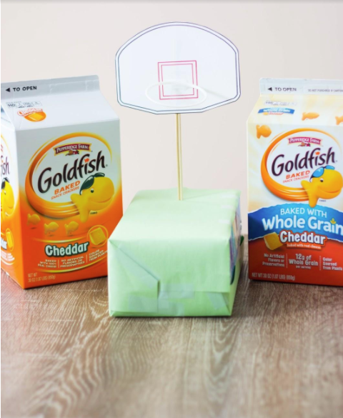 Start off by covering your small box with the construction paper. Once covered, stick the two kabob sticks down into the box, and then tape your backboard printable to the sticks. Cut off the rim of the the disposable cup, and tape onto the backboard to use as a rim, and then bust out the Goldfish crackers to see how many points your kids can get before halftime!